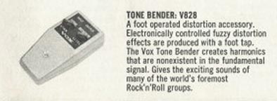 Syd Barret with a Tone Bender, May 1967 •1967 May - Syd Barrett of Pink Floyd is seen with a Tone Bender at the Games for May concert on May 12th, although it appears not to be plugged in. He normally used a Selmer Buzz-Tone (FZ-1 clone variant) for distortion. It is often stated that the fuzz Syd was seen with in this perfirmance is an Italian Vox Tone Bender, but this is not the Italian made Vox. It is an original Tone Bender made in London by Sola Sound. Based on the appearance, chicken head knobs, and the date of use, this is most likely a Professional MKII Tone Bender. Sola Sound made the MK1.5 and MKII (both the Vox branded version and Sola Sound branded version) all in this same case style. •1967 - Marshall Supa Fuzz on market. This was the second Supa Fuzz version, a rebranded Tone Bender Professional Mark II made by Sola Sound of London for Marshall. Almost exactly the same circuit as the Mark II. Two of these prototype Supa Fuzzes are known to exist. One is marked only with the "Supa Fuzz" text, the other is branded with Marshall, like the production units. •1967 - Ennio Uncini is made the new head of EME after Oliviero Pigini (president of EKO and EME) dies in 1967. •1967 August - Jimmy Page is seen using his gold Tone Bender during the Yardbirds performance in the The Village Theatre in Greenwich Village, New York, August 25, 1967. Jake Holmes was the opening act and played Dazed and Confused, which the Yardbirds would later cover as their own song. Led Zeppelin recorded a reworked version of the song a few years later, with no credit to Holmes. •1967 September - Tom Jennings is fired (according to Vox chief engineer Derek Underdown, and apprentice John Oram) as head of JMI by JMI owners The Royston Group, along with several other long time JMI employees, including Derek Underdown. The relationship between JMI/Vox and EME ends and Ennio Uncini resigns/or is fired from EME and goes to work for EKO. Reportedly Tom and others had long been unhappy with the things going on within the company and business practices he did not agree with. •1967 November - Jimmy Page is seen using his gold Tone Bender during the Yardbirds performance at the PNE Gardens Auditorium, in Vancouver British Columbia, November 10, 1967. Italian made black face Vox Tone Bender from a 1967 Vox Catalog •1967 November or earlier - Vox Tone Bender on market. This is the Italian made Tone Bender, manufactured by JEN in Pescara, Italy. Gary Hurst has stated (in Guitarre 2003) that the first Italian Tone Benders were actually made by Eko, where the AC-30 was made, then moved to Jen. It was sold around the world, and is usually the unit most people think of when they hear the name Tone Bender. The Italian Vox TB replaced the briefly made Vox TB MKII manufactured by Sola Sound in 1966. The most likely reason for JMI to use Italian production instead of continuing to use Sola Sound would have been that the mass production capabilities were far larger at JEN, and the Italian's charged less than Sola Sound. Vox products were sold world wide, so capacity would have been the primary factor. Vox had used multiple manufacturers for Organs, Wah Wah pedals, and guitars in the past, to meet demand for product, so this was common. A Vox Tone Bender has been seen with an inspection tag for Vox V828 #5035, dated "13 November 1967". The enclosure was similar to the Sola Sound Mk1.5/MKII case, in silver hammerite finish with a black logo panel. Later production changed to a black enclosure with silver panel. There is some disagreement about who was responsible for the original circuit design. According to JMI/Vox engineer Dick Denney, the Vox TB was based on a fuzz circuit he designed for Vox in the early 1960's that was not brought to market. The Italian Vox circuit seems to be based on the two-transistor Tone Bender MK1.5 circuit. Gary Hurst has stated there were no two-transistor Sola Sound Tone Benders, but at other times claimed to be the designer of the two-transistor Tone Bender. In 2009 he stated, "Vox then linked up with an Italian company, copied the casting, but changed the insides - it went back to the two transistor design and they really were terrible." He stated in 2003 that Vox used used a two transistor circuit, rather than three like the Sola Sound version, simply to save on production cost. •1967 - Elka Fuzz made by Jen for Elka Electronics, in Pescara, Italy. In the same enclosure as the Italian made Vox Tone Bender. The circuit is very similar to the Buzzaround/Tone Bender MK III circuit. Gary Hurst claims he designed this circuit for Elka. •1967 - Elka Dizzytone Fuzz, possibly made by JEN for Elka in Italy, but the enclosure does not match any JEN or OEM enclosures. The circuit is very similar to the Burns Buzzaround/Tone Bender Mk III circuit. •1968 - Gary Hurst leaves England Sometime in early 1968 and moves to Italy. Doug McDonald is now Macaris primary engineer and supervises building the effects. Gary continued to work with the Macaris/Sola Sound years later on projects, and ran the Eurotec brand in Italy in the late 1970's, building pedals for CBS/Arbiter and Meazzi, and electronic pianos for Korg. •1968 - Tom Jennings creates Jennings Electronic Industries (JEI) in 1968. Dick Denney and Vox Custom Shop manager Mick Bennett join JEI. •1968 - JMI/Vox and Thomas Organ Vox Wah-Wah production is moved to Italy, made in EME, their joint venture factory. •1968 - Jimmy Page plays session guitar on March 29-30th for Joe Cocker's With A Little Help from My Friends album, including the title track, which sounds like a Tone Bender. Jimmy Page using his gold Tone Bender with the Yardbirds on the Bouton Rouge French television show, March 1968 •1968 March - Jimmy Page uses a Tone Bender in a MK II style case for the Yardbirds appearance on their Bouton Rouge French television show, March 9th 1968. He clearly switches the pedal on and off for the guitar solos. •1968 April - Guitarist Ala