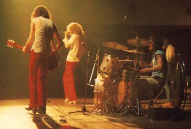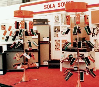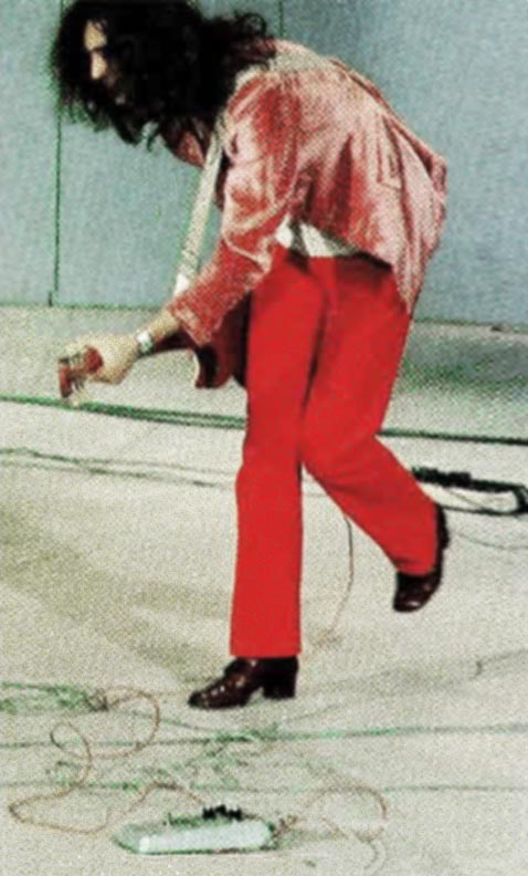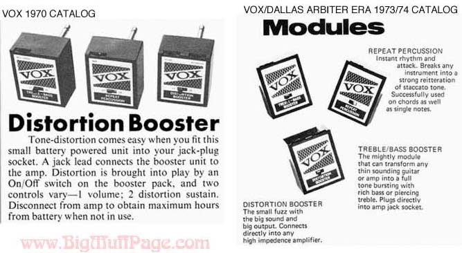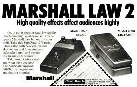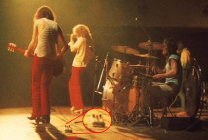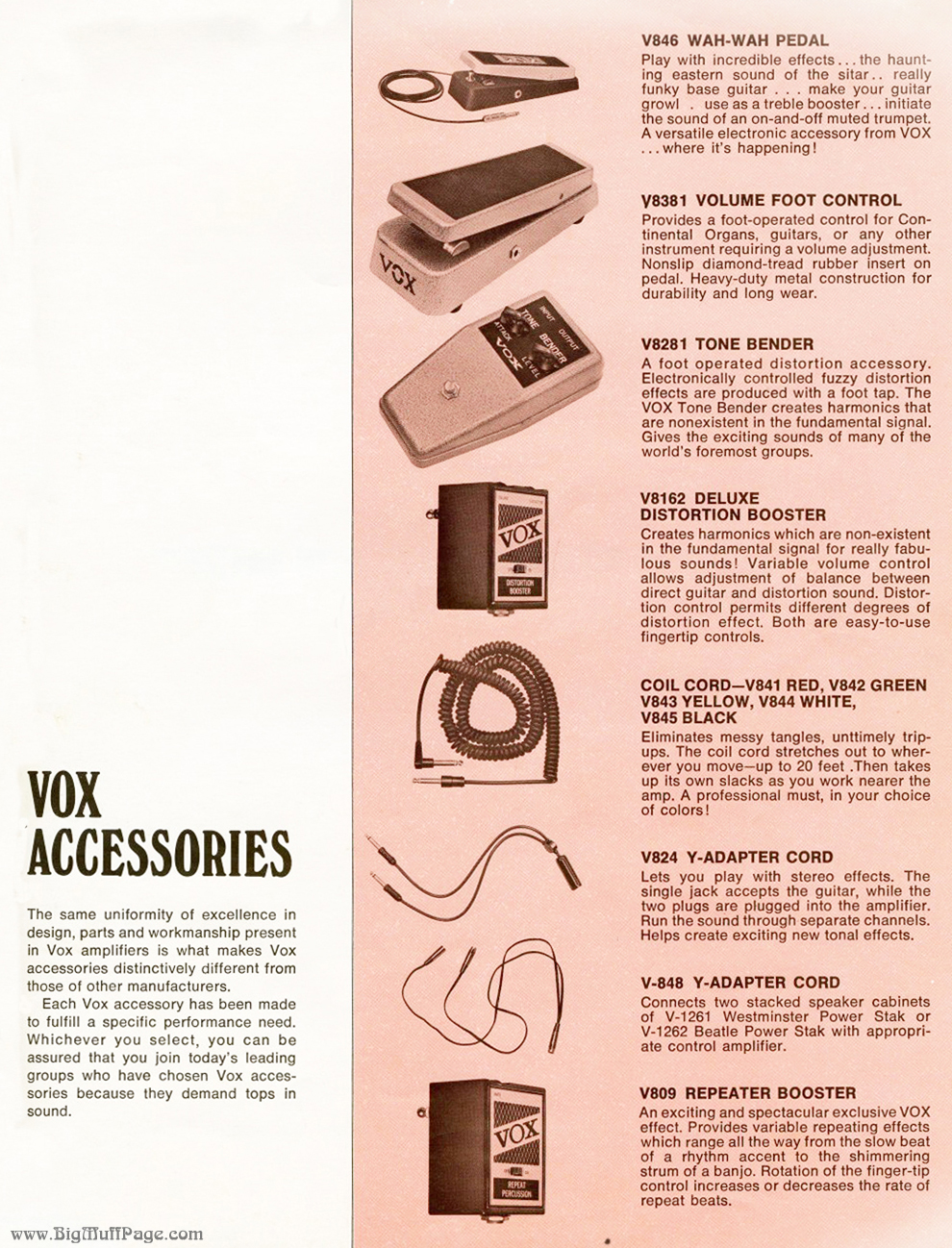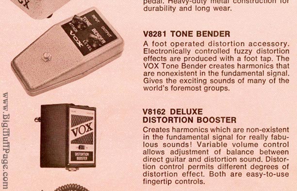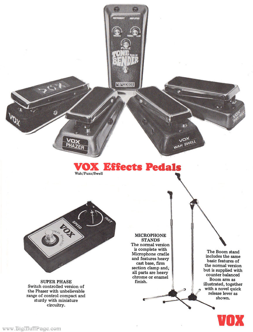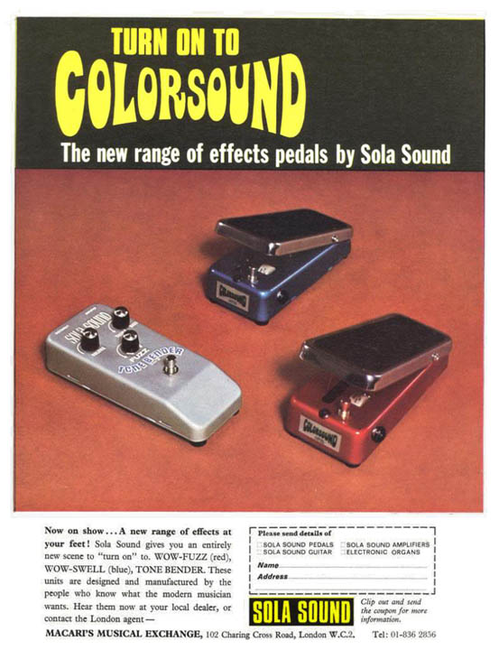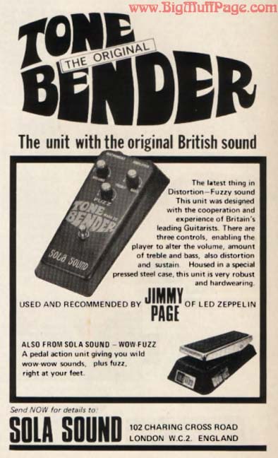 Jimmy Page Tone Bender and wah pedals from the Danmark's Radio performance. It is unclear if this is Page's previous gold Tonebender, or a silver Tonebender •1969 March - Jimmy Page uses a Tone Bender in a MK II case for Led Zeppelin's Danmark's Radio performance on March 17th (available on the Led Zeppelin DVD). The Tone Bender is wrapped with white tape, possibly because the bottom plate screws were lost, or simply as a quick way to remove the bottom plate to change batteries. Jimmy played through an Arbiter Power One Hundred (similar to a Sound City 105) amp with the drive set high for a dirty tone. A Fender Bassman speaker cabinet is under the Arbiter and a Rickenbacker Transonic cab to the right. Although many people think Jimmy's Tone Bender seems to be on through most of the performance, it is more likely the overdriven tone is simply the Arbiter amp. Jimmy can be seen and heard switching his Tone Bender on for the Dazed and Confused solo and can be heard switching it on for the solo in How Many More Times, then seen turning it off again before the bow solo. Becasue the footage is black and white, it is unclear if this is Page's previous gold Tonebender, or a silver Tonebender. Based on the tape wrapped around the case, this is most likely the sampe silver Tonebender he was seen using shortly thereafter. Led Zeppelin's performance for the Supershow film, March 1969, with a new silver Tonebender. •1969 March - Jimmy Page again uses the same tape-wrapped silver Tone Bender for Led Zeppelin's performance in the Supershow movie, filmed on March 25, 1969 in Staines, England. The film premiered in London in Novemeber 1969, and featured a number of different bands and musicians. Page played through a WEM Ultimus amp and WEM speaker cabinets. Jimmy Page with his Tone Bender for the May 1969 Screaming Lord Such sessions. Jimmy is holding the Gibson Les Paul sold to him by Joe Walsh in April, and first used in Led Zeppelin's late April San Francisco shows. •1969 May - Jimmy Page and John Bonham play on the Screamin Lord Such sessions for Lord Such And Heavy Friends, recorded in a few days beginning May 7, 1969 at Mystic Studios in Hollywood. A Tone Bender can be seen on the floor in one studio photo. Lord Such gave Page guitr credits and credited him as a producer of the album, but Page has stated he only helped with the backing tracks for a few of the songs, did not produce the album, nor did he play any of the solos. Jimmy Page with a Rotosound Fuzz Box for Led Zeppelin's Tous En Scene television appearance, June 1969 Jimmy Page using a Rotosound Fuzz Box for Led Zeppelin's performance in Bristol, England, June 1969 •1969 June - Jimmy Page spotted using a Rotosound Fuzz Box on stage with Led Zeppelin for the Tous En Scene television appearance, June 19th Paris, France. The Rotosound is identical to the Sola Sound Tone Bender Mark III circuit. It was spotted on stage again few days later on the 21st in Bristol, then again at the Royal Albert Hall perfrmance on the 29th. Jimmy was using his Arbiter Power One Hundred amp through Marhsall speaker cabinets. Vox 1969 - 1973 catalog pages •1969 - The Deluxe Vox Distortion Booster is moved into a new square plastic plug-in enclosure, made in Italy. It was first shown at the 1968 Musical Instrument Trade Fair in London. This new version included both volume and distortion controls. The exact same unit was sold under various brands, including Jen, Elka, Jen, GIS, and GEM, and the same enclosure was used to house the other plug-in Vox boosters. In the 1970 Vox catalog it lost "Deluxe" from the name, and thereafter was simply called the Distortion Booster. •1969-1970 - JEN Elettronica in Italy takes over production of the Vox Wah-Wah pedals and eventually manufactures the entire line of Vox effects. Sola Sound advertisement circa 1971, and Sola Sound trade show booth from 1970, displaying the new Colorsound line •1970 - The Colorsound trademark first appears in magazine ads, featuring a range of Colorsound branded pedals made by Sola Sound in their new manufacturing facility. The Tone Bender was given a new look, and the words Hit It by the foot switch. The address shown in ads from this period is 102 Charing Cross Road, London W.C.2. By 1972 they would be exporting Colorsound effects pedals to 48 countries worldwide. It seems Macaris occupied both 102 and 100 Charing Cross at this time store fronts at this time. 102 Charing Cross, located right beside 100, was formerly a clothing shop. Around 1973 Emerson Lake and Palmer's Manticore Records label office was located above it. •1970 January - Led Zeppelin play the Royal Albert Hall. Jimmy Page supposedly used a Rotosound Fuzz Box, but he also used custom Hiwatts at this time with the preamps modified to give more gain. The Rotosound is an OEM label version of the MKIII Tone Bender made for Rotosound by Sola Sound of London. •1970 February - Sola Sound MKIII Tone Bender advertised in the February 1970 issue of Beat Instrumental. Macaris/Sola Sound had an arrangement with Page to supply him with any of the latest products that he may require in return for using him in their advertising. •1970 - MKIV Tone Bender on market. This was basically the MKIII Tone Bender in a new shaped sheet metal case, to differentiate it from the Vox Mark III Tone Bender in the slanted case. This case style would become the standard from this point on for Sola Sound and Colorsound branded products, and was the most common case style ever used for Tone Benders. It was silver with white and blue graphics, including the MARK IV brand. The circuit was the same as the MKIII, but a few resistor and cap values were changed over time. 1970 Marshall Supa Fuzz advertisement •1970 - Vox is sold to a consortium. Reg Clark leaves Vox in January and joins Dallas Arbiter. Jimmy Pagewith a silver Tone Bender for Led Zeppelin's performance at Casino de Montreux, August 1971 •1971 - Jimmy Page is seen with a silver Tone