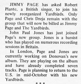 •1968 September - Jimmy Page and his new Yardbirds lineup (John Paul Jones, John Bonham, Robert Plant) play a handful of live dates in Sweden to fulfill old Yardbirds contractual obligations. •1968 September - Jimmy Page and his new Yardbirds lineup (John Paul Jones, John Bonham, Robert Plant) record as the backing band for P.J. Proby's album Three Week Hero at Olympic Studios, London, in September 1968. Jimmy's Tone Bender can be heard on several tracks, such as Mery Hopkins Never Had Days Like These. •1968 October - Jimmy Page and his new Yardbirds line up are set to do a few dates in England. The band name is changed to Led Zeppelin (noted in Disc Magazine, October 1968), as ex Yardbirds bassist Chris Dreja owned the Yardbirds name and did not want them using it. Zeppelin went back into Olympic Studios, London around this time to record new material from September 27-October. The material was mixed in October, the band went on tour with the new material in the US in December, and the self titled album Led Zeppelin was released January 1969. There is a wide variety of dirty rhythm, distorted power chords, and distorted lead tones on the album. How to get these tones from Jimmy's simple setup has baffled guitarists for years. Several of the tracks on the album sound very similar to Jimmy's live 1968 sound with the Yardbirds which featured a slightly dirty amp tone and a gold Tonebender for leads. The fact that the Yardbirds had different amps at every filmed appearance means they were probably all house amps or rentals - Vox solid state Super Beatle, Vox AC-100, Fender Dual-Showman, et cetera. In a Guitar World interview by Brad Tolinski in 1997 Page talked about the gear he used on the first LZ album: "It was basically whatever we could afford at that time. I didn’t really make any money when I was with the Yardbirds, so I was pretty broke in the beginning. I actually had to finance the first Zeppelin album with money I had saved as a session musician. What I had as equipment was very minimal. I had my Telecaster that Jeff Beck gave me, a Harmony acoustic, a bunch of Rickenbacker TransSonic cabinets left over from the Yardbirds, and a hodge-podge of amps - Vox and Hiwatts, mostly. I also had a black Les Paul Custom with a big tremolo arm...All I used for pedals was an Echoplex, a Tonebender distortion and a wah-wah...If you listen to the first album, the Tele is doing all of that with the pedals I just mentioned. It was certainly doing the job." The Tone Bender was used for heavy rhythm work and solos, along witha Vox Wah Wah pedal. It was likely a Tone Bender Professional Mark II but, as with his Yardbirds sound, many of the leads have the heavier gated bloom of the first version of Marshall Supa Fuzz circuit made by Sola Sound. That circuit was a MKI Tone Bender with the distortion (attack knob) fixed at maximim internally and a filter control in place of the attack knob. It was used in the Supa Fuzz briefly, then Sola Sound switched to use a slightly modified MKII Tone Bender circuit. The normal MKII circuit gets close for these tones, but the filter control version of the Supa is closer. Since both versions of the circuit were being made by Sola Sound around the same time in late 1966, it is possible some MKIIs were made with the Supa Fuzz circuit inside, and that is what Page had. According to him, most of the album was recorded using his Yardbirds Telecaster through a small Supro amp with a 12" speaker that he bought in 1961 or 1962. Supro amps were made by Valco in Chicago. There is much debate about which Supro amp Jimmy used, but Albert Lee, who turned Page on to Supro amps in his session days, said his own Supro had a 15" speaker and confirmed he thinks Jimmy bought a smaller 12" one. The only Supro amps available at that time with a 12" speaker were the 1624T and 1690T. Here is a relevant Jimmy Page quote from a 1977 Steve Rosen interview, when asked what kind of amplifiers he was using for session work: "A small Supro, which I used until someone, I don’t know who, smashed it up for me. I’m going to try to get another one. It’s like a Harmony amp, I think, and all of the first album (Led Zeppelin) was done on that." The exact amp is not as important however, as Jimmy could get similar tones through a variaety of amps in those Yardbirds television appearances. In my opinion the core lead tones can be achieved simply with a combo of the Tone Bender (MKII or filter control Supa Fuzz) and Telecaster, using the Tele volume knob to control the amount of distortion, and the tone pot turned to the bass side to control tone color. Using the Wah in a fixed (cocked wah) position along with the Tone Bender, and certain volume and tone settings on the Tele, also creates a wide range of similar tones. For example, try turning a Tele tone pot completely to the bass side, set the volume near 10, set the wah to the bass end of the filter sweep, and switch on a MKII Tone Bender with the attack knob at maximum. Although much of the studio recording includes beautiful room reverb from distant micing techniques and delay, if you play around with a Tele, Tone Bender, and a Vox Wah into a clean or slightly dirty tube amplifier, it is possible to find nearly all of the tones heard on the album. As a side note, Roger Mayer was often confusingly cited by Page in later years as the maker of his Gary Hurst Tone Bender (see December '68 entry below). There have been rumors circulating that Page put his Roger Mayer fuzz circuit inside his Yardbirds/LZI Tone Bender because he liked the Tone Bender case better, or that Mayer made the mod himself. Mayer also worked for Olympic Studios where Led Zeppelin I was recorded. This has led some to believe Zep I was recorded using the Mayer fuzz. It is worth pointing out that Mayer was actually on tour with the Jimi Hendrix Experience in 1968-early 1969. He did not go to work for Olympic Studios until after Led Zeppelin was recorded, and he has denied 